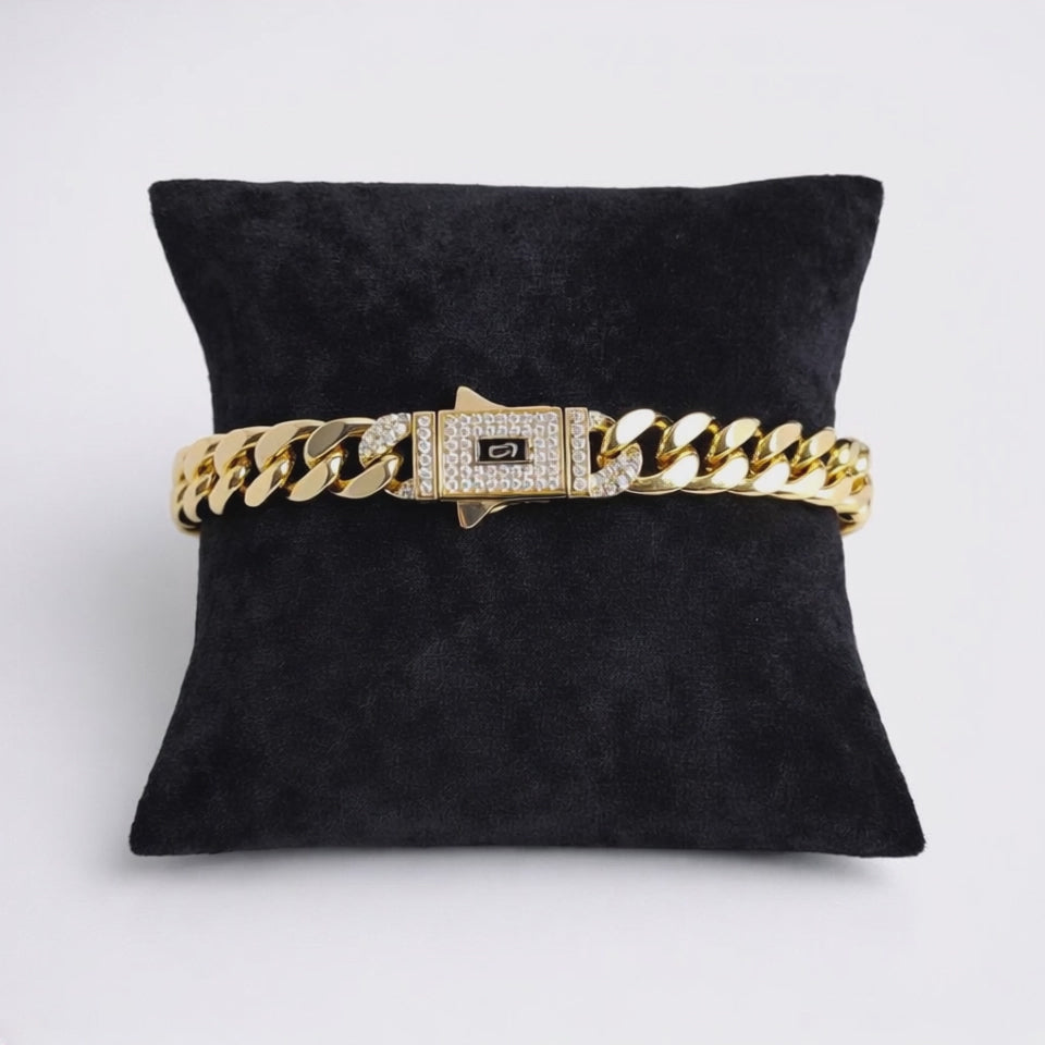 Altın tonlu kalın zincir formu, taşlarla bezeli kilit detayıyla tamamlanarak bilekte net ve sofistike bir duruş yaratır. Maskülen çizgilerin feminen ışıltıyla dengelendiği bu parça, modern stilin güçlü bir imzasıdır.